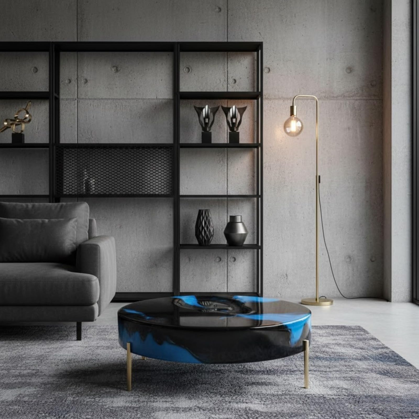 As seen in the image, this table pairs effortlessly with grey sofas, concrete walls, black steel shelving, and warm gold accent lighting — creating a cohesive, magazine-worthy interior aesthetic that is both masculine and luxurious.