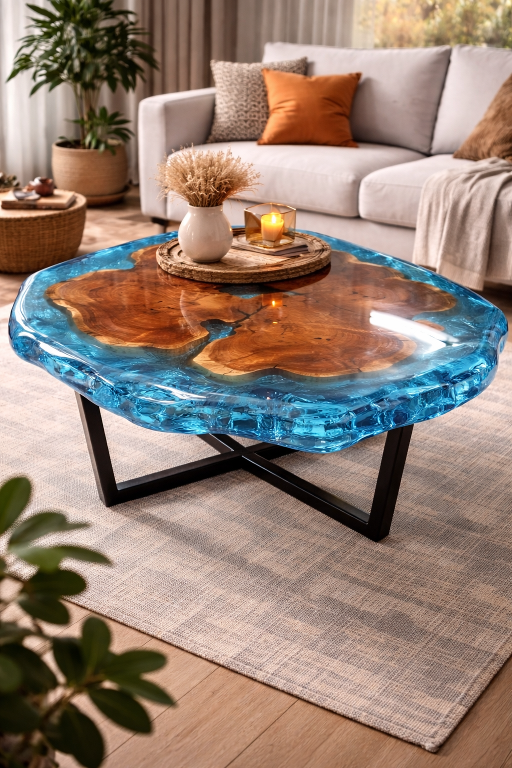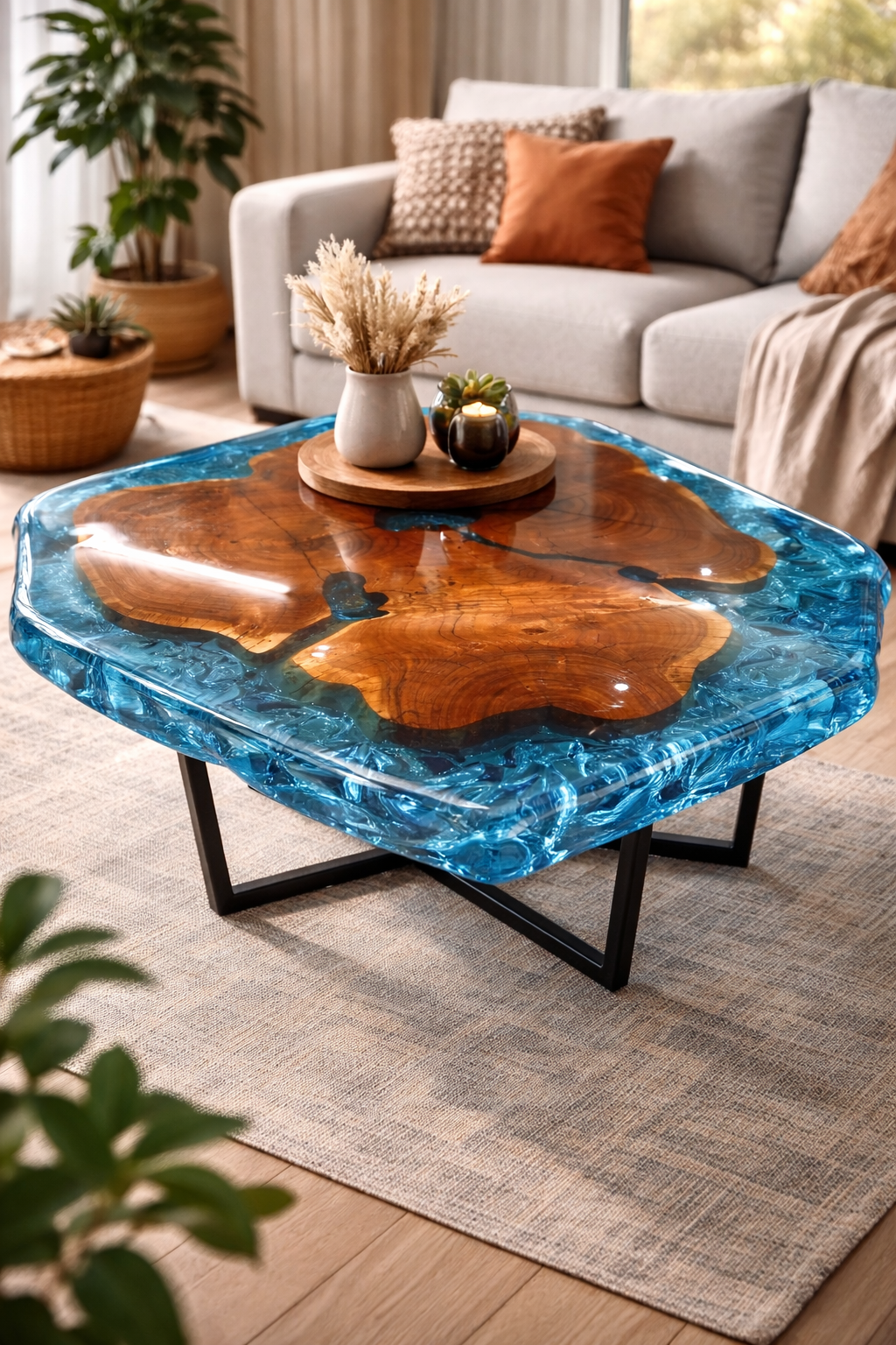 Upgrade your living space with this custom  epoxy resin crystal center table, designed to blend natural wood beauty with modern luxury aesthetics. Crafted with precision, this handmade epoxy resin wooden table features a stunning crystal-clear blue resin finish that highlights the organic wood grain, creating a truly unique and premium centerpiece.