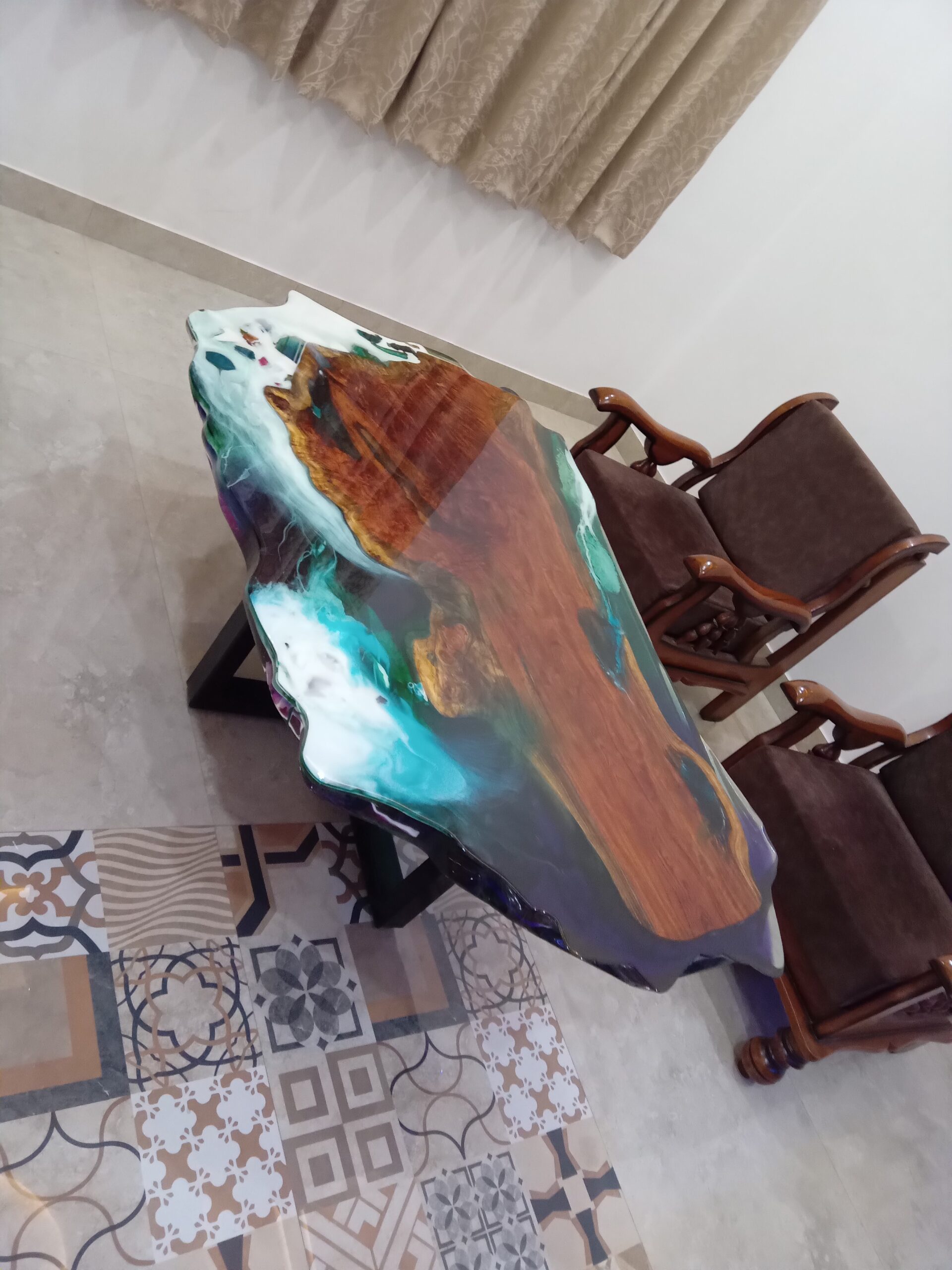 Bring the beauty of the ocean into your living room with our custom epoxy resin wooden ocean style center table — India’s most breathtaking handmade furniture piece. Built around a single large live-edge solid wood slab, its warm rosewood grain and natural knot details are preserved under a flawless high-gloss finish, while a multi-colour ocean resin border — teal, aqua, turquoise, white foam, and deep violet — wraps the slab like a sun-kissed shoreline.
