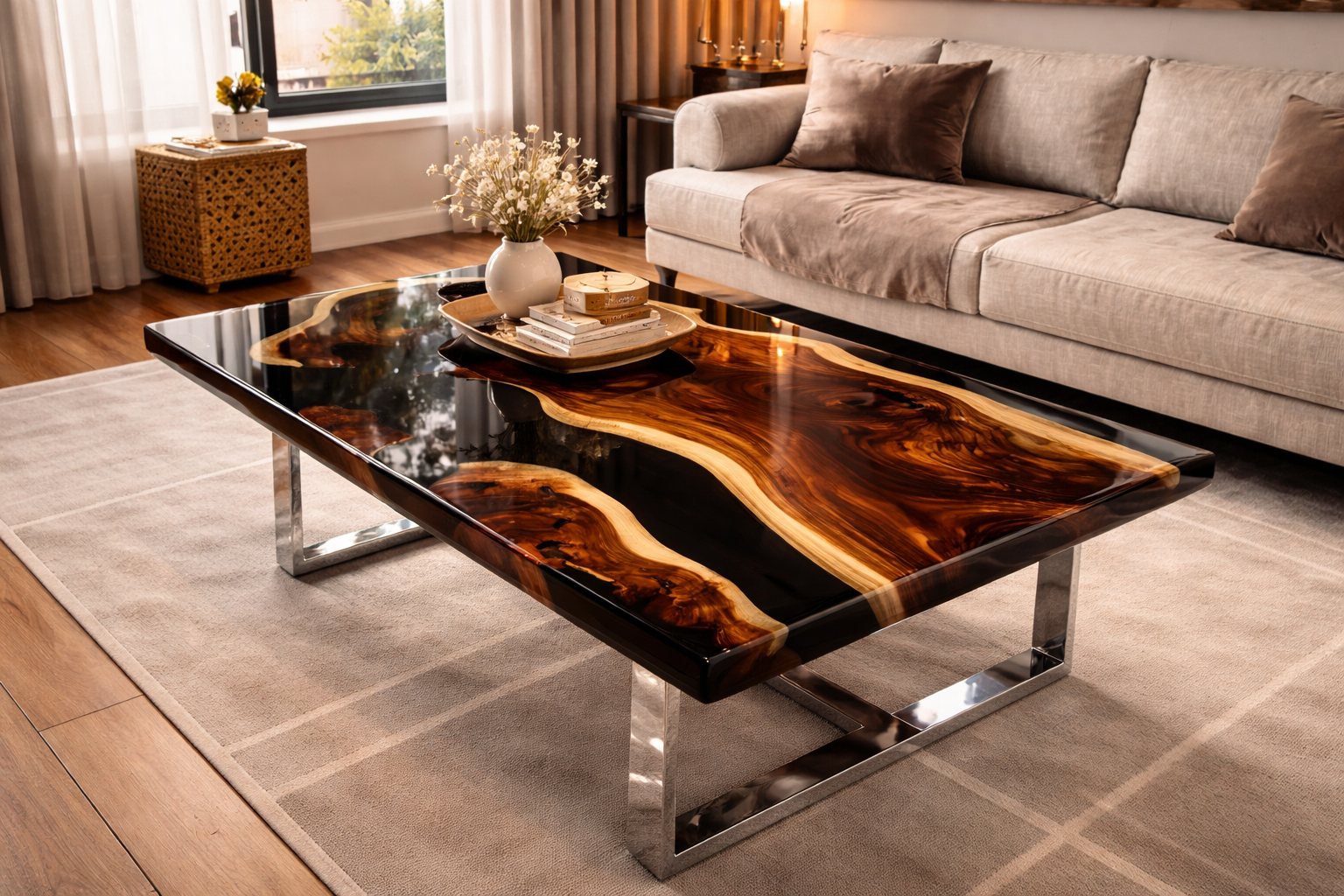 Bring artistic luxury into your home with this epoxy resin art wood dining table, crafted using premium live-edge wood and a deep glossy resin finish. This handmade custom dining table showcases natural wood grains flowing through rich black resin, creating a bold and unique modern statement piece.