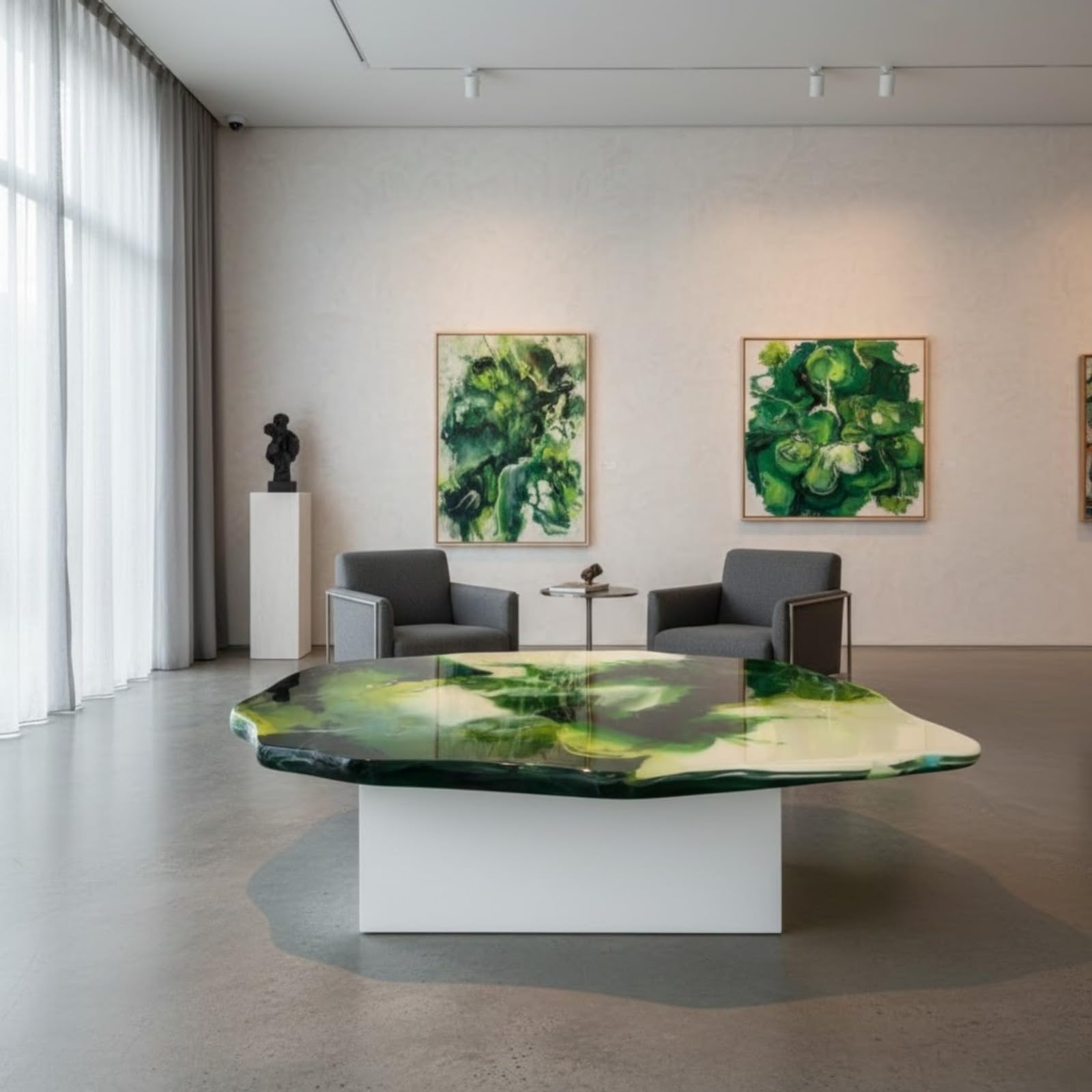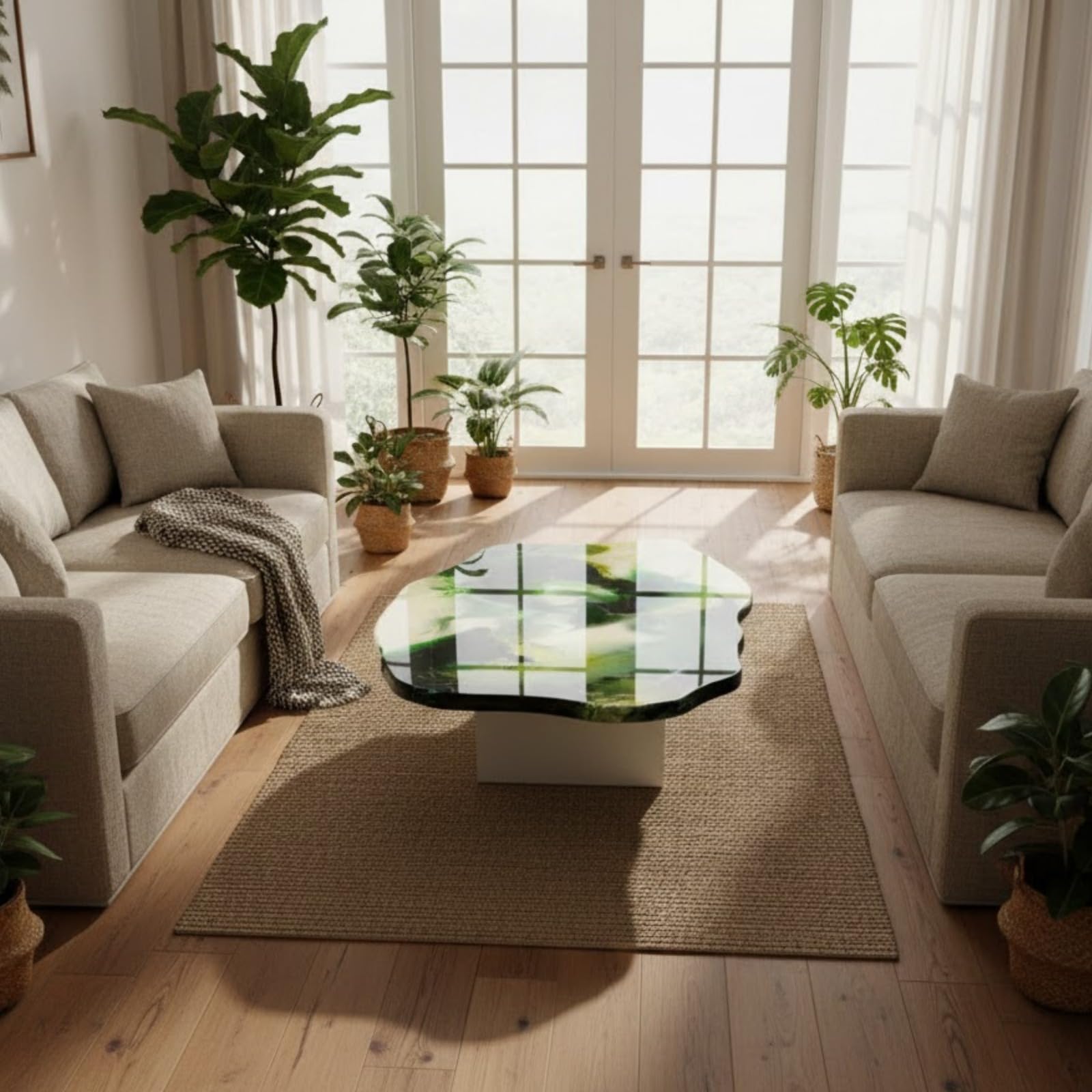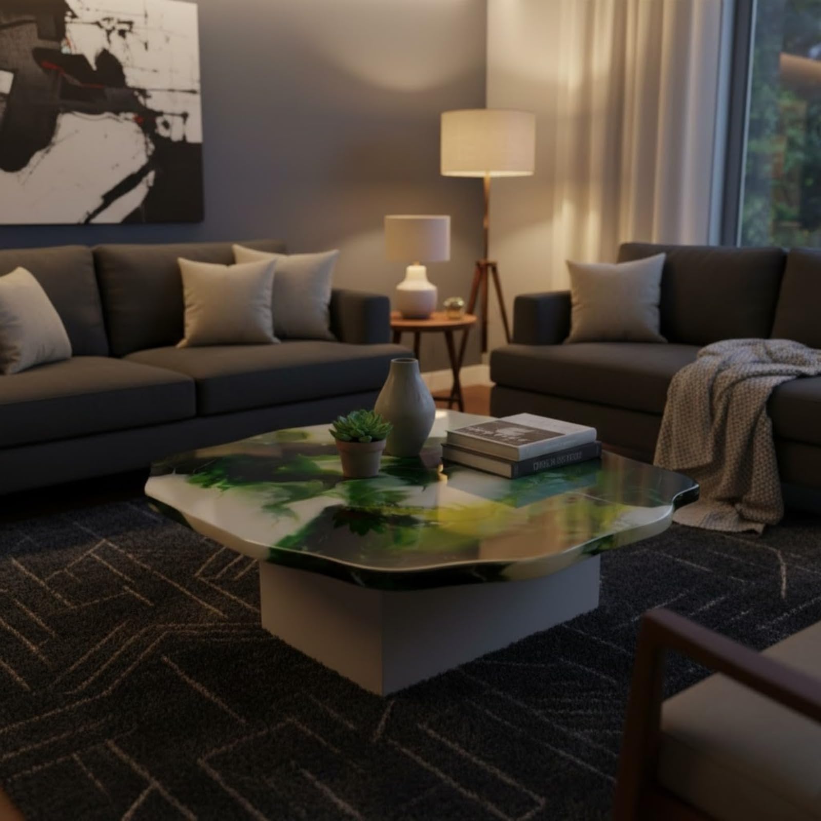 ![Modern Abstract Green & White Swirl Geode Table | Epoxy Resin Art Coffee Table | Irregular Shape [122 x 91 cm] - Image 5](https://reziwood.com/wp-content/uploads/2026/03/Luxury-geode-art-coffee-table-green-white-swirl-organic-edge.jpg)