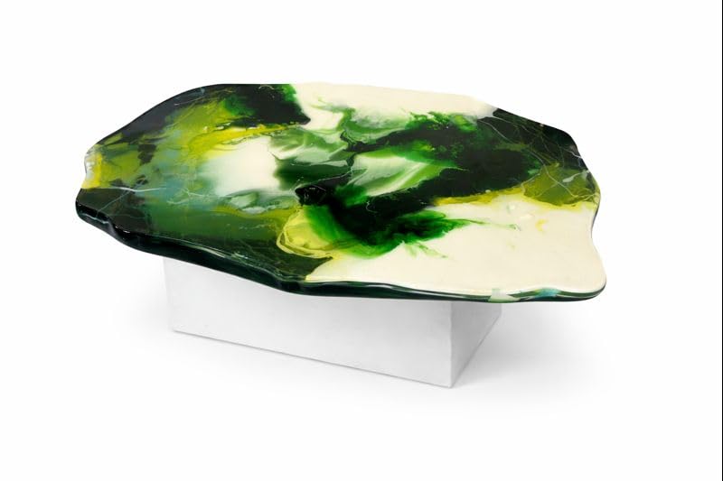 The Design Story The tabletop of this geode art coffee table tells a vivid story in green and white. Deep forest green pools and swirls across the surface like ancient moss-covered stone. Vivid lime green bursts through with electric energy, mimicking the raw mineral deposits found in malachite and green agate geodes. Pure luminous white flows through the composition like quartz crystal veins — catching light and creating an almost glowing translucent effect at the edges. Together these colours create an abstract expressionist composition of extraordinary visual complexity and natural beauty.
