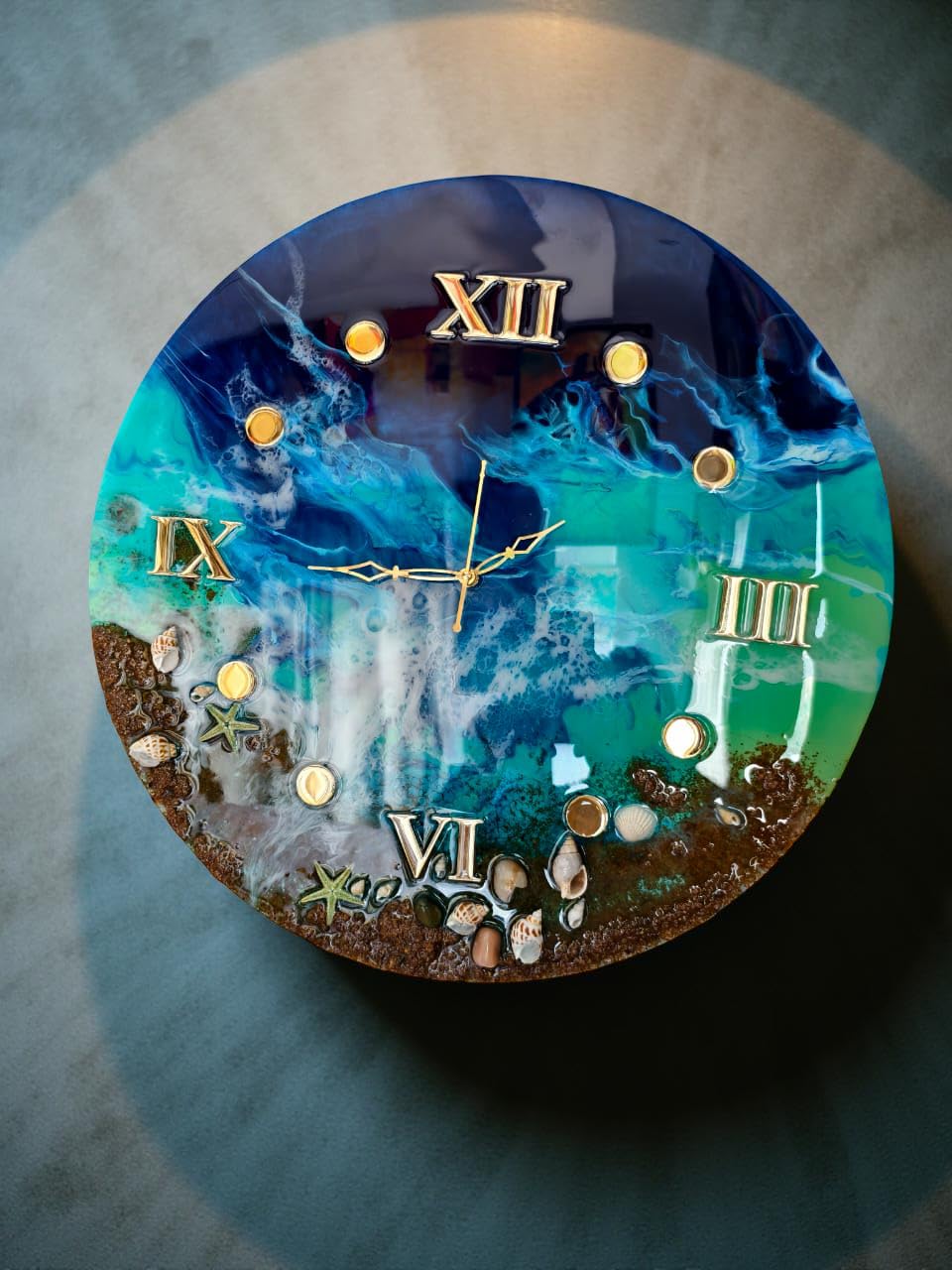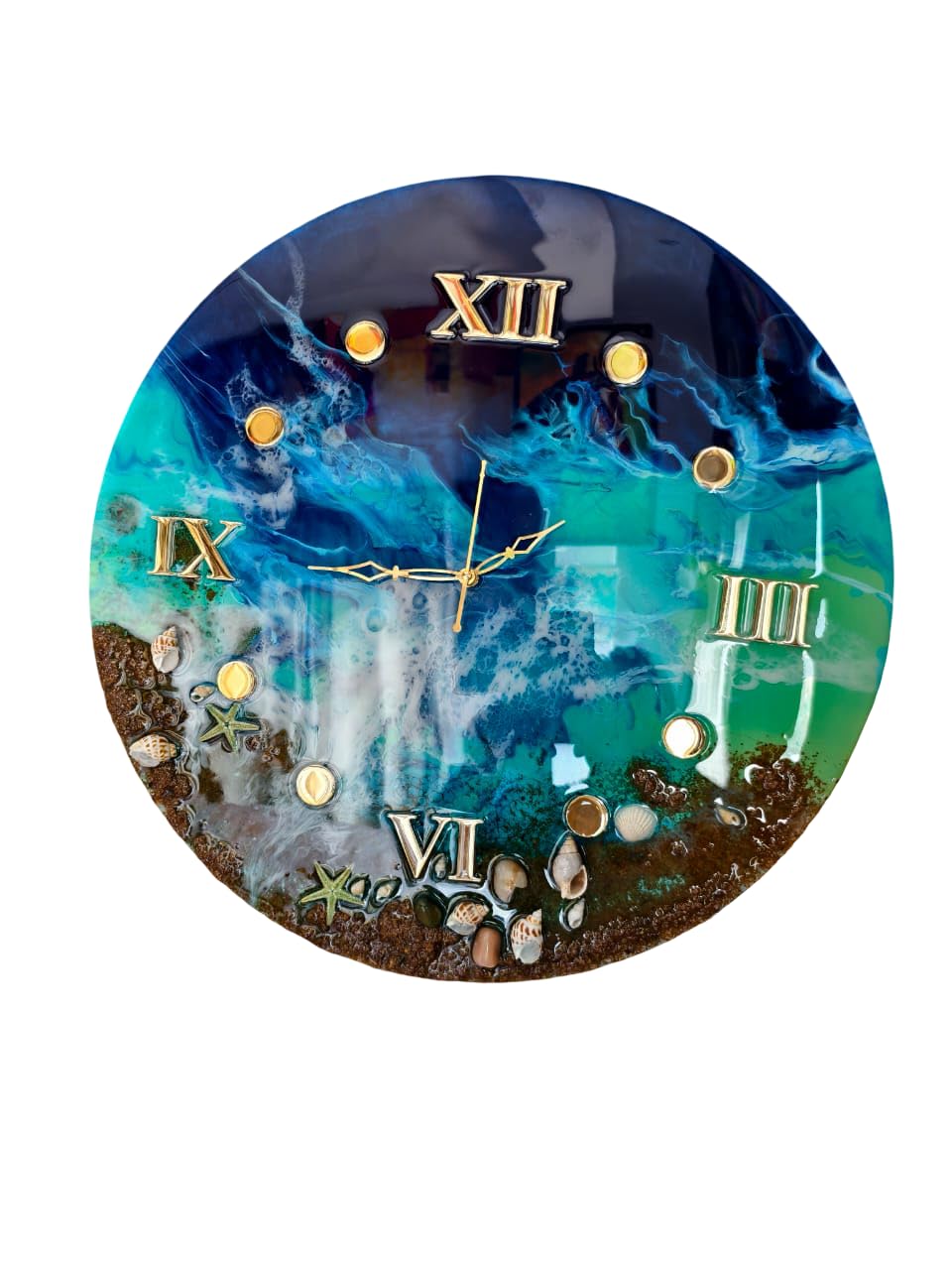 Elevate your home with our Ocean Resin Art Wall Clock, a stunning masterpiece that blends functional timekeeping with high-end coastal aesthetics. This handmade timepiece features deep blue pigments and shimmering luxury resin waves poured over a solid wooden base, capturing the raw beauty of the Arabian Sea.