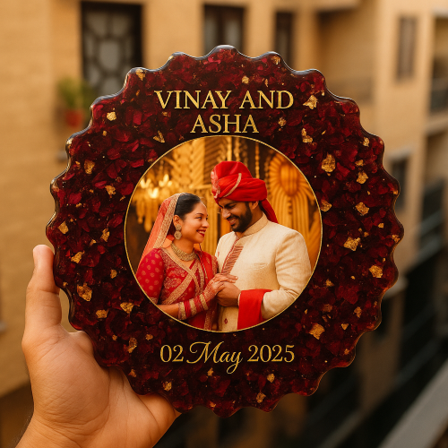 Exquisite Details & Customization In this specific design, we’ve embedded rich red rose petals and shimmering gold leaf accents to create a regal backdrop for your favorite wedding portrait. We professionally print and seal your photo at the center, accompanied by the couple’s names (e.g., “Vinay and Asha”) and your wedding date in elegant gold lettering. The high-gloss, crystal-clear resin finish ensures that your memories stay as vivid as the day you said “I do.”